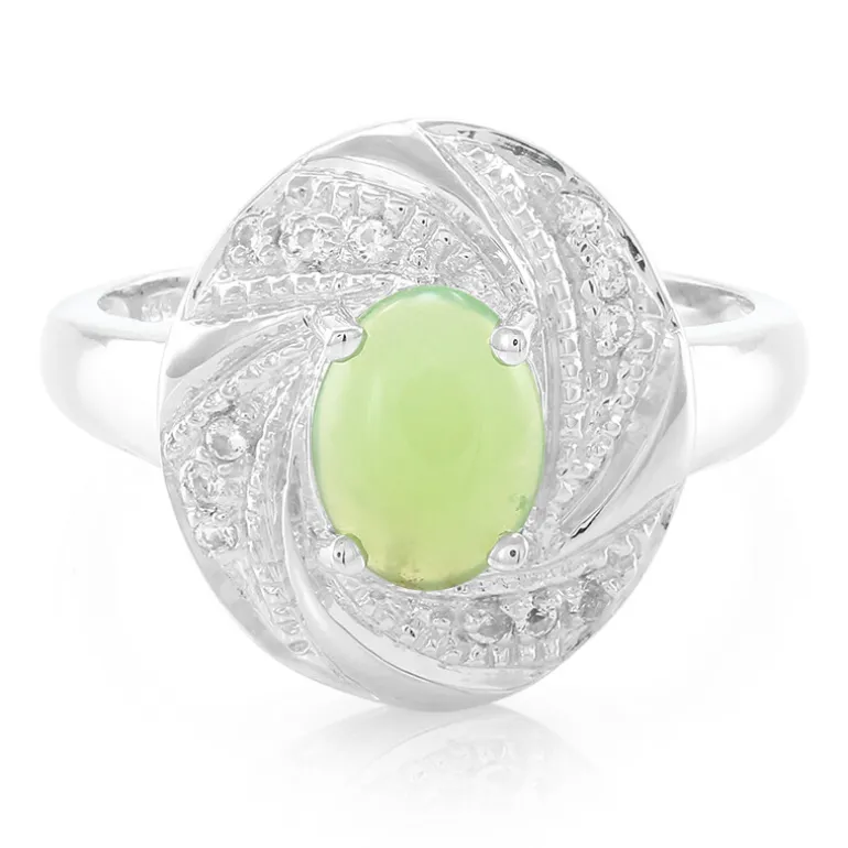 Entdecken Sie die leuchtende Anziehungskraft unseres Rings mit australischem Chrysopras, der von einem ovalen Cabochon von 0,63 Karat hervorgehoben und von 12 runden weißen Topasen im Brillantschliff umgeben ist. Der aus hochwertigem 925er Sterlingsilber gefertigte Ring setzt mit seinem frischen Grün einen lebendigen Akzent und verleiht Ihrer Kleidung eine frühlingshafte Ausstrahlung. Er ist ideal, um einem legeren Look einen Farbakzent zu verleihen oder als Statement-Stück für den Abend. Das filigrane Design sorgt für eine bequeme Passform und macht ihn zu einer ausgezeichneten Wahl für den Alltag oder besondere Anlässe.