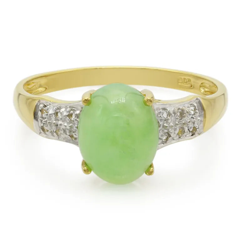 Entdecken Sie die faszinierende Anziehungskraft dieses Rings aus 925er Sterlingsilber, der aufwändig vergoldet wurde. Sein Herzstück ist ein prächtiger australischer Chrysopras von 1,46 Karat im ovalen Cabochon-Schliff, der einen üppigen, grünen Charme ausstrahlt. Den zentralen Edelstein flankieren 12 runde, brillante Weißtopase aus Brasilien, die einen funkelnden Kontrast bilden. Das Gesamtkaratgewicht von 1,507 ct kombiniert die satten Grüntöne mit funkelnder Klarheit. Dieser Ring eignet sich ideal für elegante Anlässe oder um Ihrem Alltagsstil einen Hauch von Raffinesse zu verleihen. Er ist ein Schatz, den man in Ehren halten sollte.