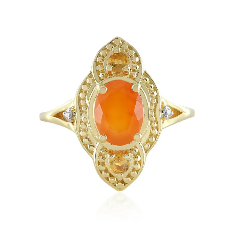 Dieser strahlende Ring aus vergoldetem 925er Sterlingsilber hebt die Wärme eines brasilianischen Karneols von 1,152 Karat im Ovalschliff hervor, umrahmt von funkelnden Zitrin- und Zirkon-Akzenten. Mit einem Gesamtkaratgewicht von 1,287 Karat ist dieser Ring eine harmonische Mischung aus satten, herbstlichen Farbtönen und elegantem Design. Er ist eine vielseitige Ergänzung Ihrer Garderobe und passt sowohl zu legeren als auch zu formellen Anlässen. Die aufwändige Verarbeitung und die leuchtenden Farben machen ihn zu einer perfekten Wahl, um jedem Outfit einen Hauch von Raffinesse zu verleihen.