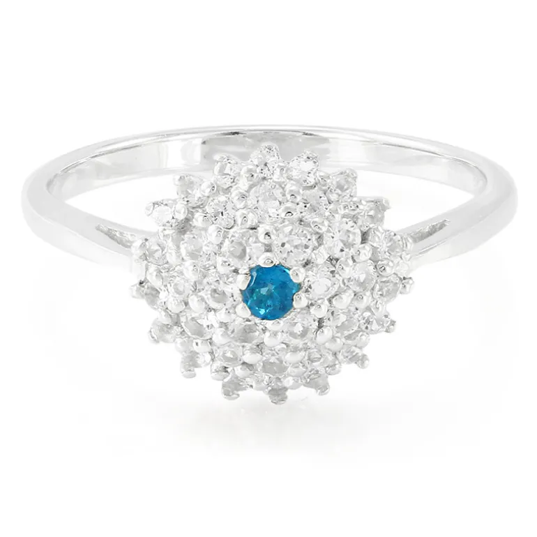 Dieser atemberaubende Ring zeigt einen fesselnden königsblauen Apatit aus Brasilien, der von strahlend weißen Topas-Steinen umgeben ist, die alle in glänzendes 925er Sterlingsilber gefasst sind. Mit einem Gesamtkaratgewicht von 0,459 verbindet dieser Ring auf wunderbare Weise moderne Eleganz mit zeitlosem Charme. Er ist eine exquisite Wahl für besondere Anlässe oder einen Hauch von Raffinesse im Alltag und eignet sich perfekt zur Aufwertung jedes Outfits.