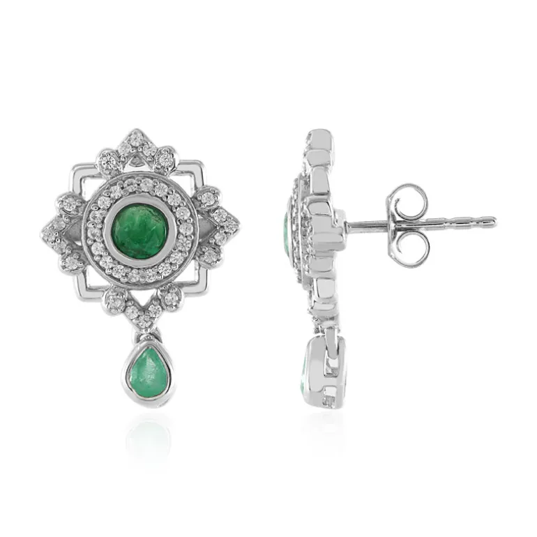 Genießen Sie das Strahlen dieser atemberaubenden Silberohrringe, die mit kolumbianischen Smaragden und funkelnden Zirkon-Akzenten verziert sind. Die harmonische Mischung aus runden und tropfenförmigen Smaragden mit einem Gesamtgewicht von 0,34 bzw. 0,244 Karat, die mit dem Glanz von platiniertem 925er Sterlingsilber kombiniert sind, verleiht ihnen einen zeitlosen Charme. Kambodschanische Zirkone mit einem Gesamtgewicht von 0,513 ct verleihen dem Schmuckstück eine schillernde Note. Mit einem Gesamtgewicht von 3,76 g sind diese 21 mm großen Ohrringe perfekt geeignet, um sowohl formellen als auch legeren Ensembles einen eleganten Touch zu verleihen.