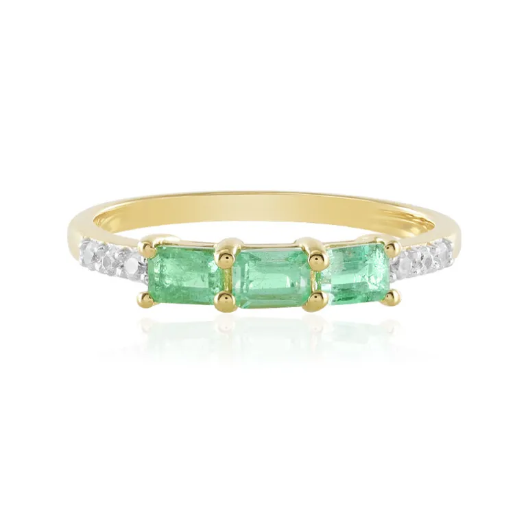 Entdecken Sie die Faszination kolumbianischer Smaragde mit diesem schicken Ring aus vergoldetem Sterlingsilber mit drei achteckigen Smaragden im Stufenschliff von 0,63 Karat. Flankiert von funkelnden kambodschanischen Zirkonen von insgesamt 0,123 ct, verbindet dieser Ring klassische Eleganz mit moderner Raffinesse. Er ist ein vielseitiges Accessoire, das zu jedem Outfit passt und sowohl tagsüber als auch abends einen farbigen Akzent setzt.
