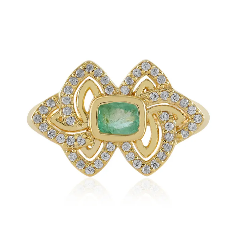 Entdecken Sie die Faszination kolumbianischer Edelsteine mit diesem Ring aus vergoldetem 925er Sterlingsilber. Mit einem Smaragd im Antikschliff von 0,321 Karat, der von einem schimmernden Cluster aus 48 Zirkonen im Rundschliff von insgesamt 0,324 Karat umgeben ist, ist dieses Schmuckstück ein Beweis für zeitlose Eleganz. Sein filigranes Design strahlt Raffinesse aus und macht ihn zu einem perfekten Begleiter für die Abendgarderobe und formelle Anlässe. Verleihen Sie Ihrem Ensemble mit diesem bezaubernden Schmuckstück einen Hauch von üppigem Grün.