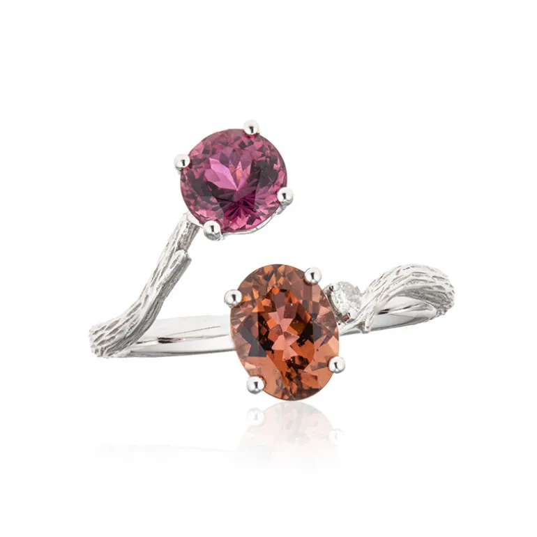 Dieser atemberaubende Ring zeigt zwei strahlende Neon Turmaline aus der Demokratischen Republik Kongo, die in sorgfältiger Handarbeit zu einem Gesamtgewicht von 1,8ct verarbeitet wurden. Der in 585er Weißgold gefasste Ring kombiniert auf elegante Weise leuchtende Farbtöne mit einem Diamanten von 0,027 Karat. Das einzigartige, ineinander verschlungene Design suggeriert ein Gefühl der ewigen Verbundenheit und macht ihn zu einer exquisiten Wahl, um besondere Momente zu feiern. Er passt perfekt zur Abendgarderobe und bringt genau die richtige Menge Farbe in jedes anspruchsvolle Outfit.