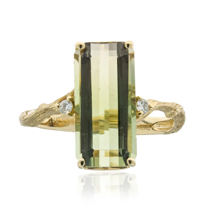 Ein prächtiger Blickfang ist dieser Ring mit einem 4,8 Karat schweren Neon-Turmalin, der mit seinem atemberaubenden, achteckigen Smaragdschliff eine leuchtende Ausstrahlung hat. Eingebettet in 14-karätiges Gelbgold, ist dieses Stück mit zwei komplementären Diamanten der Reinheit I1 von insgesamt 0,044 Karat akzentuiert, die dem Design einen Hauch von Glanz verleihen. Die Goldfassung mit einem Gewicht von ca. 1,92 Gramm umschließt den Edelstein elegant und schafft ein harmonisches Gleichgewicht zwischen zeitloser Raffinesse und modernem Reiz. Dieser Ring eignet sich perfekt, um einem Cocktailkleid einen farbigen Akzent zu verleihen oder ein Alltagsoutfit aufzuwerten und ist vielseitig einsetzbar.