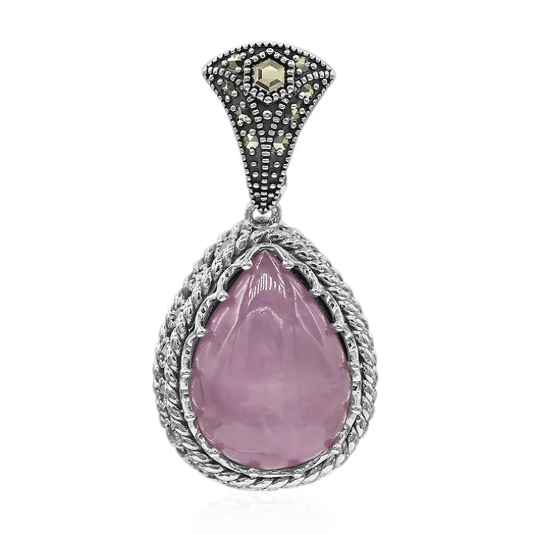 In der Mitte dieses bezaubernden Anhängers befindet sich ein 18 x 13 mm großer, tropfenförmiger Kunzit-Cabochon aus Afghanistan mit einem Gewicht von 10,65 Karat. Er ist wunderschön umrahmt von österreichischen Marcasiten mit einem Gesamtgewicht von 0,502 Karat, die alle in 925er Sterlingsilber mit einem Gewicht von 6,1 Gramm gefasst sind. Die ausgeprägten sechseckigen und runden Schliffe der Markasite bilden einen geometrischen Kontrast zu den sanften Kurven des Kunzits. Der mit einem Varioclip versehene Anhänger misst 37×18 mm und ist ein perfektes Schmuckstück für besondere Anlässe oder zur Aufwertung Ihrer Alltagskleidung.