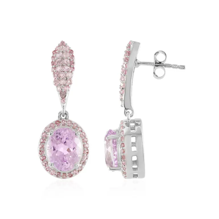 Entdecken Sie die sanfte Romantik dieser atemberaubenden Ohrringe mit strahlenden Kunzit-Edelsteinen aus Afghanistan, umrahmt von einem Gefolge rosa Turmalin-Akzenten aus Nigeria. Die aus platiniertem 925er Sterling Silber gefertigten Ohrringe haben ein Gesamtgewicht von 7,459 Karat und verleihen jedem Ensemble einen Hauch von Raffinesse. Die ovalen Kunzit-Steine sind so geschliffen, dass sie die zarten Farbtöne der Turmaline ergänzen und die Brillanz maximieren. Diese Ohrringe eignen sich sowohl für die Eleganz am Tag als auch für den Glamour am Abend und werden zu einem wertvollen Bestandteil Ihrer Sammlung.