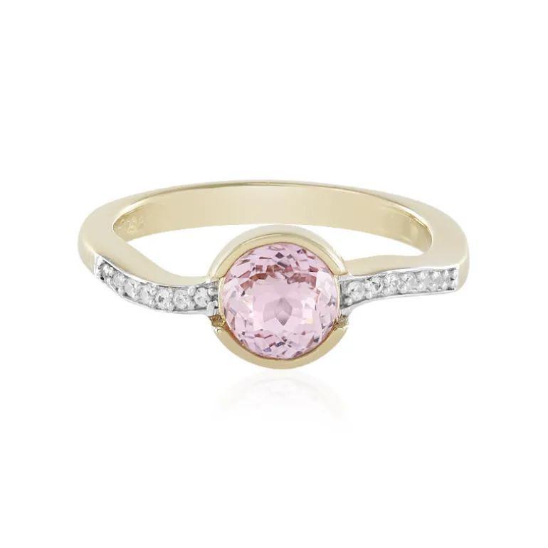 Entdecken Sie die zarte Anziehungskraft unseres anmutigen Kunzit-Rings mit einem runden Stein von 0,99 Karat aus Pakistan, der durch eine Reihe von funkelnden Zirkonen von insgesamt 0,088 Karat aus Kambodscha ergänzt wird. Dieses Schmuckstück aus 925er Sterlingsilber mit einem Hauch von Goldplattierung hat ein Gesamtgewicht von 1,078 ct. Sein modernes und schickes Kreuzband-Design macht ihn zu einem idealen Accessoire, das sowohl tagsüber als auch abends einen Hauch von pastellfarbener Eleganz verleiht.