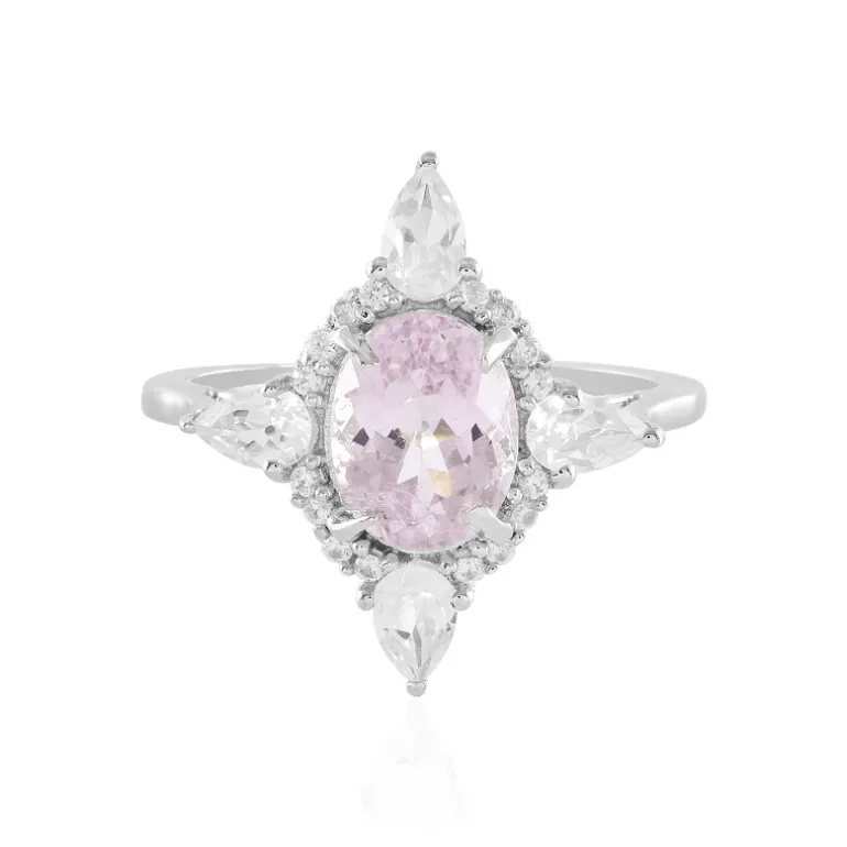 Dieser Ring aus Sterlingsilber mit einem ovalen Kunzit von 1,787 Karat, der aus den ruhigen Landschaften Afghanistans stammt, bezaubert durch sein sanftes Lichtspiel. Kunstvoll akzentuiert von Zirkonen im Birnen- und Rundschliff aus Kambodscha mit einem Gesamtgewicht von 1,293 ct, zieht das bezaubernde Lichtspiel die Blicke auf sich. Mit Platin überzogen, um seinen Glanz zu verstärken, ist dieser Ring ein Fest der Eleganz und der Handwerkskunst. Er eignet sich sowohl als eleganter Alltagsschmuck als auch zur Ergänzung der Abendgarderobe bei besonderen Anlässen.