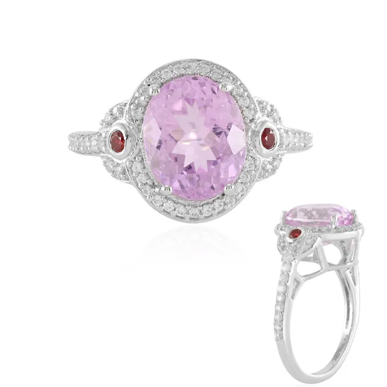 Dieser bezaubernde Ring vereint einen afghanischen Kunzit von 4,177 Karat im Ovalschliff mit dem feurigen Funkeln tansanischer Rubine und einer Reihe kambodschanischer Zirkonakzente. Die Kombination ist in platiniertes 925er Sterlingsilber gefasst, das für dauerhaften Glanz sorgt. Der luxuriöse 11×9 mm große Kunzit in der Mitte des Steins besticht durch sein sanftes Lila, das von den schimmernden Zirkonen umrahmt wird und einen atemberaubenden Kontrast bildet. Dieser Ring eignet sich perfekt, um jedem Ensemble einen Hauch von Eleganz zu verleihen, und zieht auf Dinnerpartys oder als raffiniertes Accessoire im Alltag alle Blicke auf sich.