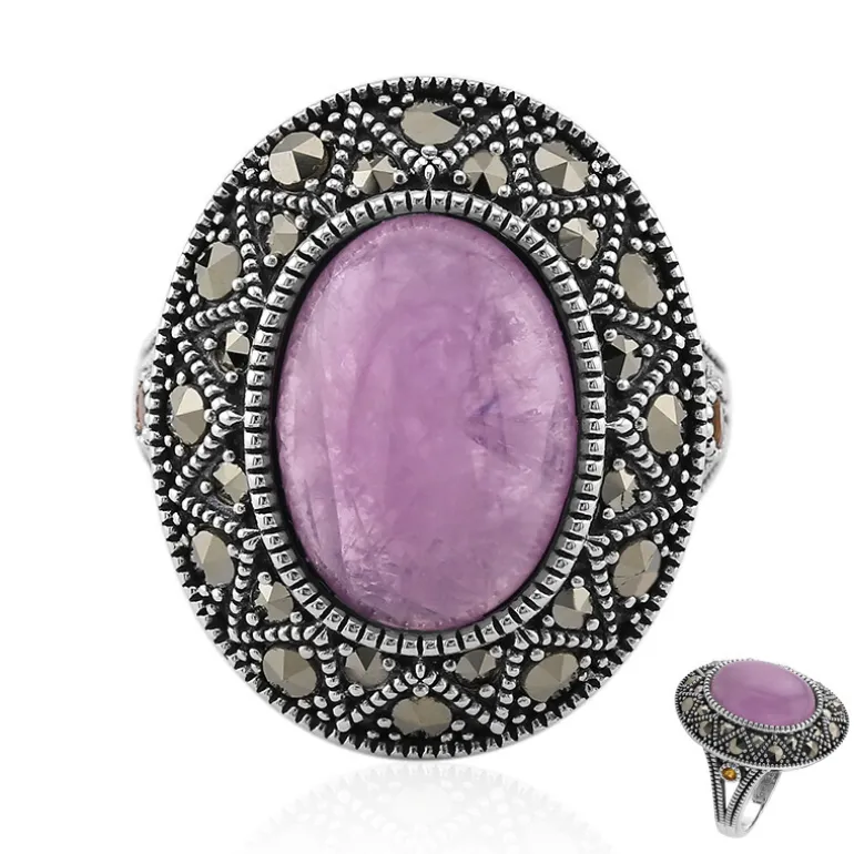 Dieser atemberaubende Ring präsentiert einen faszinierenden ovalen 6,4-karätigen Kunzit-Cabochon aus Afghanistan, gefasst in hochwertigem 925er Sterlingsilber. Begleitet von funkelnden Mandarin-Citrinen im Rundschliff und österreichischen Markasiten, strahlt das Schmuckstück eine Kombination aus Eleganz und Brillanz aus. Der satte Lavendelton des Kunzits passt perfekt zu den warmen Tönen des Zitrins und macht ihn zu einem vielseitigen Accessoire, das sowohl tagsüber als auch abends getragen werden kann. Gönnen Sie sich dieses zeitlose Design, das mit seinem ausgeprägten Vintage-Charme jedes Ensemble aufwertet.