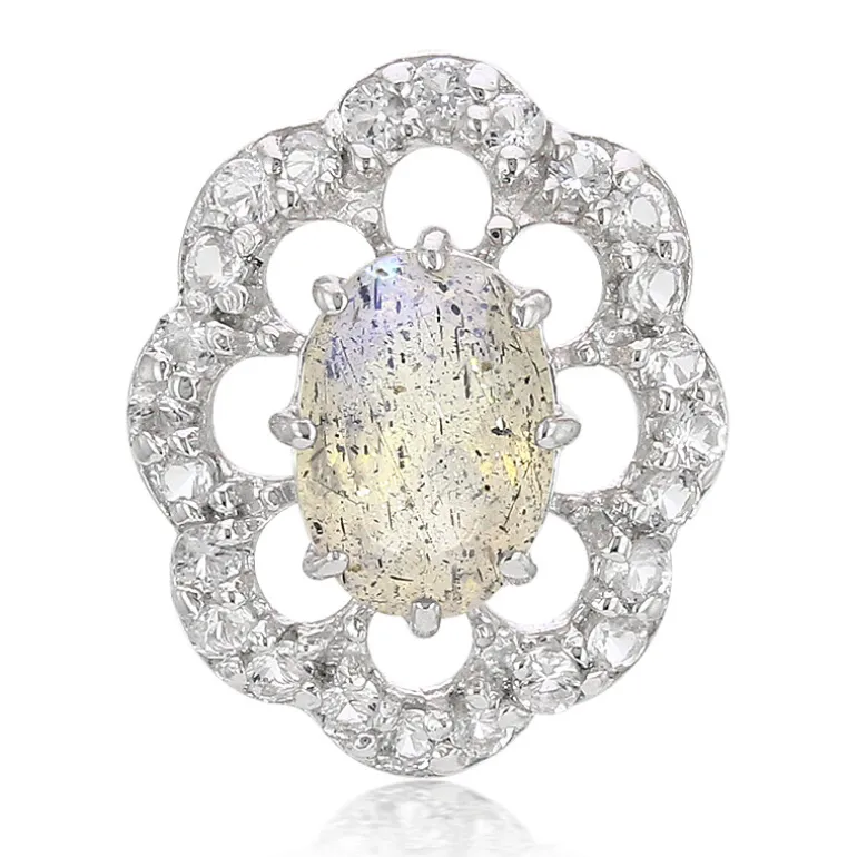 Entdecken Sie die bezaubernde Anziehungskraft dieses Labradorit-Anhängers aus Madagaskar, gekrönt von einem funkelnden weißen Topas. Der ovale Labradorit, der für sein faszinierendes Farbenspiel bekannt ist, wird von 24 strahlenden Topasen im Rundschliff mit einem Gesamtgewicht von 0,907 ct umrahmt und ist aus 925er Sterlingsilber gefertigt. Das filigrane Design ist sowohl klassisch als auch vielseitig, ideal für den Charme des Tages und die Eleganz des Abends. Der bezaubernde Schimmer dieses Schmuckstücks verleiht Ihrem Outfit einen Hauch von Raffinesse.