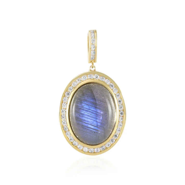 Entdecken Sie die Mystik Madagaskars mit diesem vergoldeten Anhänger aus 925er Sterlingsilber, der einen faszinierenden Labradorit von 9,05 Karat enthält. Der ovale Cabochon strahlt ein bezauberndes Farbenspiel aus, das durch die Brillanz von 42 kambodschanischen Zirkonen ergänzt wird, die seine Umrandung zum Funkeln bringen. Dieser Anhänger ist ideal, um jedem Ensemble einen Hauch von Eleganz zu verleihen. Er kann bei gesellschaftlichen Anlässen für Gesprächsstoff sorgen oder als Accessoire im Alltag getragen werden.