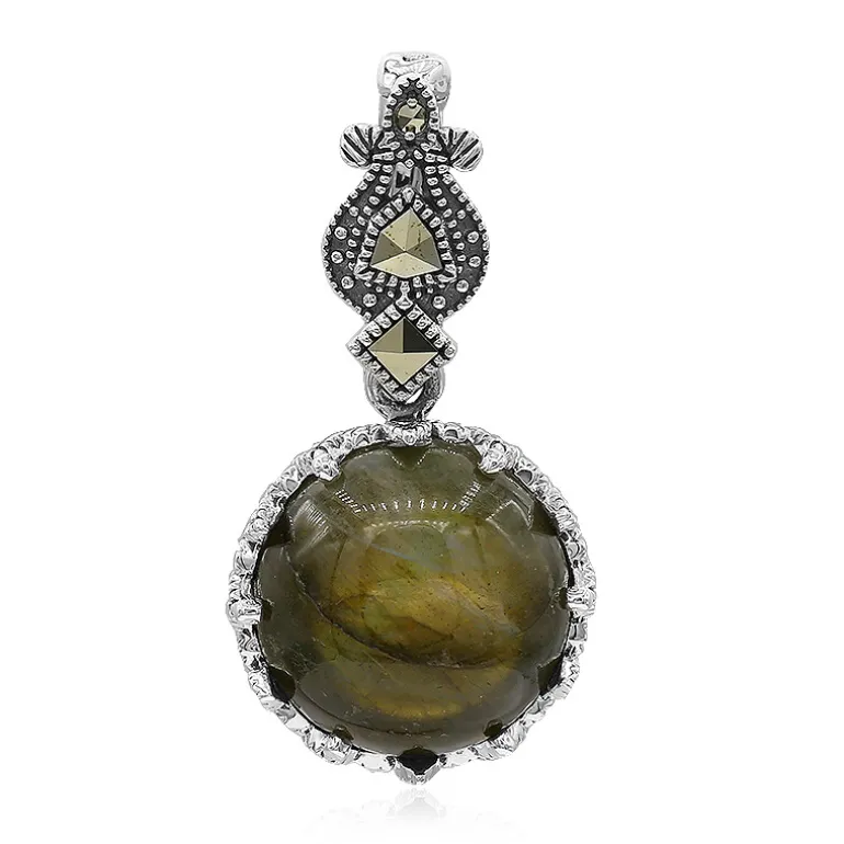 Entdecken Sie die mystische Anziehungskraft dieses exquisiten Anhängers, der aus hochwertigem Labradorit aus Madagaskar mit einem fesselnden runden Cabochon-Schliff gefertigt ist. Der zentrale Edelstein ist von einem Ensemble aus schimmernden Markasiten aus Österreich umgeben, die in aufwändiger Weise geschliffen wurden, um seinen Vintage-Charme zu unterstreichen. Die Basis aus Sterlingsilber verleiht ihm einen Hauch von zeitloser Eleganz. Dieser Anhänger ist ideal für alle, die komplizierte Handwerkskunst zu schätzen wissen. Er kann zu einem Abendkleid oder einer schicken Bluse getragen werden und sorgt für einen eleganten Look.