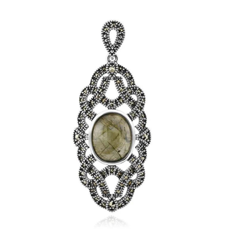 Entdecken Sie die Mystik des Labradorits aus Madagaskar mit diesem bezaubernden Anhänger aus Sterlingsilber. Der ovale Cabochon mit einem Gewicht von 3,4 Karat wird von einem filigranen Design umrahmt, das mit 69 funkelnden Markasiten aus Österreich verziert ist und ihm einen Hauch von Vintage-Charme verleiht. Mit einer Größe von 43 x 18 mm und einem Gewicht von ca. 4,3 g strahlt dieses Schmuckstück Raffinesse aus. Es eignet sich perfekt, um der Abendgarderobe einen eleganten Touch zu verleihen oder ein legeres Ensemble aufzuwerten und ist eine vielseitige Ergänzung für jede Schmucksammlung.