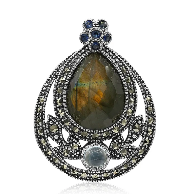 Entdecken Sie die mystische Anziehungskraft dieses tropfenförmigen Labradorits aus Madagaskar mit 6,84 Karat, verziert mit brasilianischem himmelblauem Topas und österreichischen Markasiten. Dieser filigrane Anhänger aus 925er Sterlingsilber hat einen Schachbrettschliff, der sein bezauberndes Farbenspiel unterstreicht. Kombinieren Sie ihn mit einem eleganten Abendkleid oder einer schicken Bluse für einen Hauch von Raffinesse. Sein zeitloses Design und die funkelnden Saphire aus Madagaskar machen ihn zu einem vielseitigen Schmuckstück, das sich perfekt in jede Schmucksammlung einfügt.