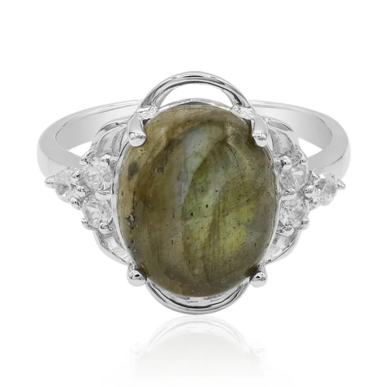 Entdecken Sie das bezaubernde Farbenspiel dieses erhabenen Rings aus Sterlingsilber, der einen ovalen Labradorit aus Madagaskar im Cabochon-Schliff von 3,3 Karat präsentiert. Flankiert von sechs funkelnden Zirkonen aus Kambodscha im Rundschliff mit einem Gesamtgewicht von 0,24 Karat, strahlt dieses Schmuckstück sowohl Erdigkeit als auch Glamour aus. Der aus hochwertigem 925er Sterlingsilber gefertigte Ring fängt das Licht wunderschön ein und ist ein Highlight für Ihre Sammlung. Er eignet sich sowohl für den lässigen Chic als auch für die anspruchsvolle Abendgarderobe und ist ein vielseitiges Accessoire, das alle Blicke auf sich zieht.