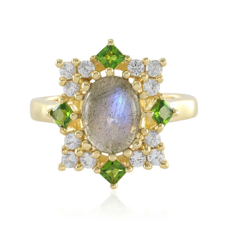 Entdecken Sie die fesselnde Anziehungskraft dieses Rings aus vergoldetem 925er Sterlingsilber, gekrönt von einem faszinierenden ovalen Cabochon aus madagassischem Labradorit von 1,937 Karat. Umgeben von einer funkelnden Reihe russischer Diopside und kambodschanischer Zirkone von insgesamt 0,962 ct. verströmt dieses fein gearbeitete Stück einen Hauch von Vintage-Charme. Er eignet sich perfekt, um jedem Ensemble einen Hauch von Eleganz zu verleihen, und ist ein Schatz, der bei jeder Veranstaltung oder Zusammenkunft Bewunderung hervorrufen wird.