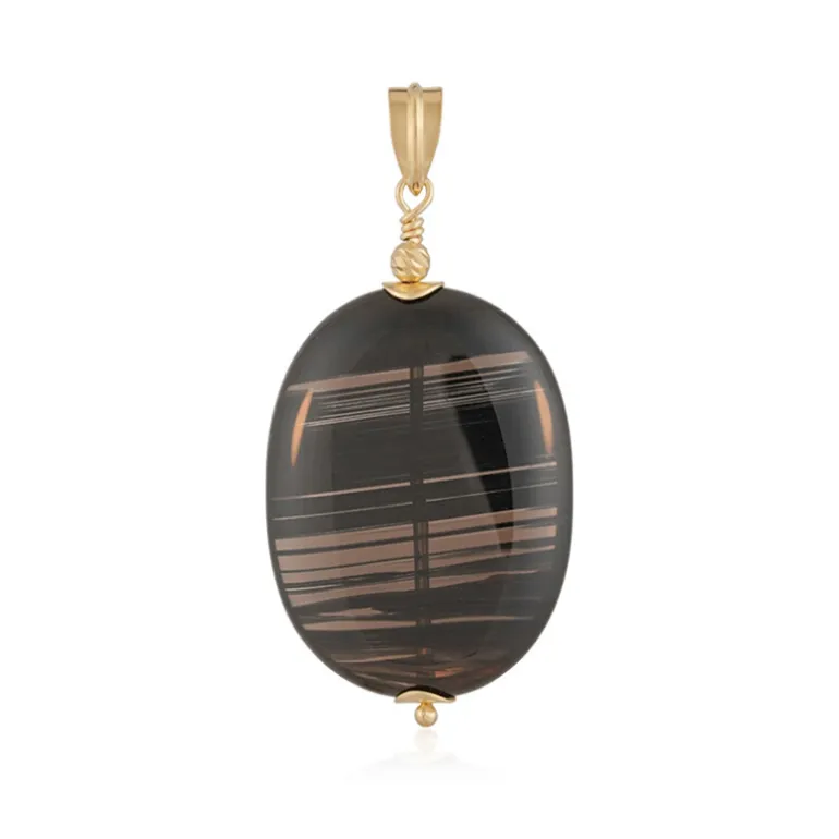 Entdecken Sie die Faszination unseres Obsidian-Anhängers aus vergoldetem Silber mit einem auffälligen 70-karätigen lamellaren Obsidian aus Mexiko. Der Anhänger aus 925er Sterlingsilber mit luxuriöser Goldplattierung zeigt ein elegantes ovales Cabochon-Design. Er eignet sich sowohl für legere als auch für formelle Anlässe und passt sowohl zu erdigen Tönen als auch zu kühnen, modernen Outfits. Setzen Sie ein Statement mit diesem einzigartigen Stück.