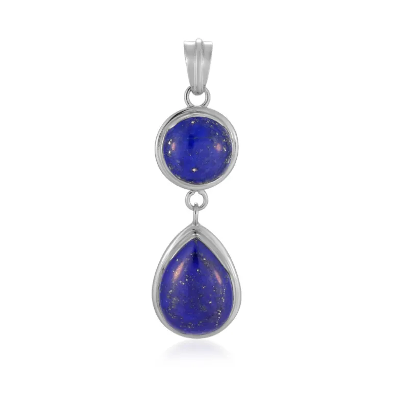 Wir präsentieren unseren bezaubernden Anhänger mit zwei prächtigen afghanischen Lapislazuli-Edelsteinen mit einem Gesamtgewicht von 16 Karat. Die tiefblauen Farbtöne des 9-karätigen tropfenförmigen und des 7-karätigen runden Cabochons werden durch die elegante, platinierte Fassung aus 925er Sterlingsilber hervorgehoben. Mit einer beachtlichen Größe von 52 x 16 mm ist dieses Schmuckstück sowohl ein Statement als auch ein Zeugnis der Eleganz. Dieser Anhänger ist ideal, um einem legeren Ensemble einen Hauch von Raffinesse zu verleihen oder um ein Abendoutfit zu ergänzen. Er ist vielseitig einsetzbar und von beeindruckender Schönheit.