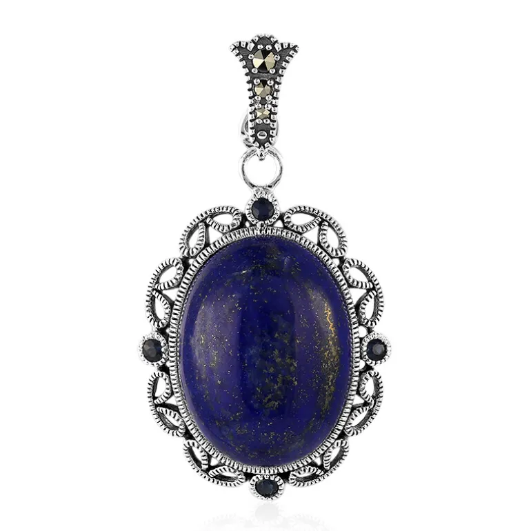 Dieser exquisite Lapislazuli-Anhänger präsentiert einen fesselnden ovalen Cabochon von 18,25 Karat aus Afghanistan. Akzentuiert von vier leuchtend blauen Saphiren aus Madagaskar und österreichischem Markasit, strahlt er Eleganz aus. Das raffinierte Schmuckstück aus 925er Sterlingsilber eignet sich ideal für formelle Anlässe und verleiht der Alltagskleidung einen Hauch von Eleganz. Perfekt für Edelsteinliebhaber, die ein einzigartiges Flair suchen.