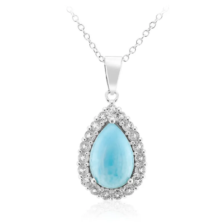 Diese bezaubernde Halskette aus Sterlingsilber zeigt einen atemberaubenden Larimar-Cabochon aus der Dominikanischen Republik, umrahmt von 19 funkelnden weißen Topas-Steinen aus Nigeria. Mit insgesamt 3,87 Karat Edelsteinbrillanz verleiht dieses Stück jedem Outfit einen Hauch von Eleganz. Perfekt für besondere Anlässe oder für das tägliche Tragen. Kombinieren Sie es mit einer schlichten Bluse oder einem Abendkleid für einen eleganten, raffinierten Look.