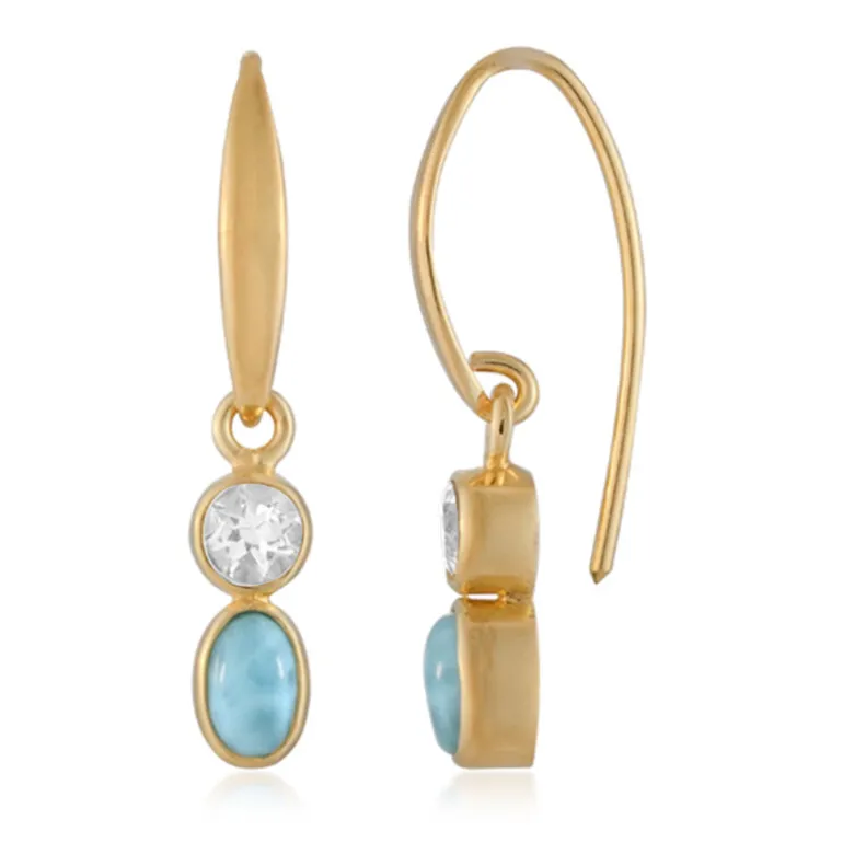 Entdecken Sie die Faszination des Larimar mit diesen atemberaubenden Ohrringen aus vergoldetem Sterlingsilber. Mit Larimar-Cabochons aus der Dominikanischen Republik und brasilianischem Weißtopas strahlen diese Ohrringe Eleganz und exotischen Charme aus. Sie eignen sich perfekt für legere bis halb-formale Anlässe und lassen sich wunderbar mit fließenden Kleidern oder schicken Blusen kombinieren und verleihen jedem Outfit einen Hauch von Raffinesse.