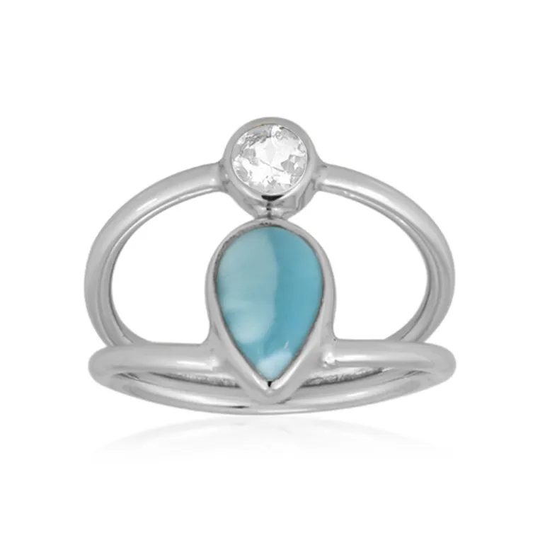 Entdecken Sie die Eleganz dieses Rings aus Sterlingsilber mit einem bezaubernden Larimar-Cabochon aus der Dominikanischen Republik und einem funkelnden brasilianischen weißen Topas. Die Kombination aus einem birnenförmigen Larimar und einem Topas im Rundschliff ergibt ein harmonisches Design. Dieser Ring eignet sich sowohl für legere als auch für formelle Anlässe und ist eine wunderbare Ergänzung für jede Schmucksammlung. Kombinieren Sie ihn mit Sommerkleidern oder formeller Abendgarderobe für einen eleganten Look.