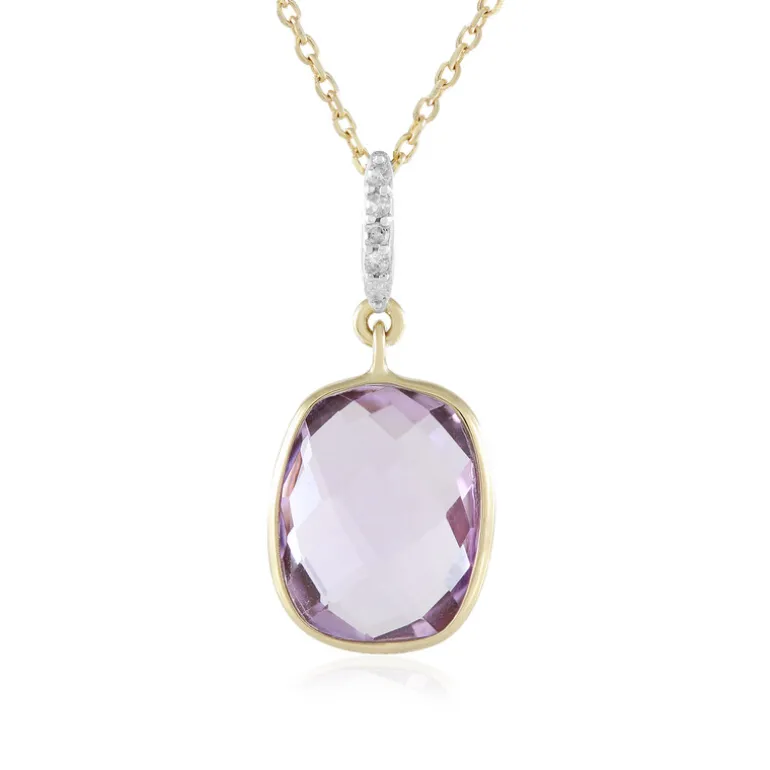 Ein raffiniertes Accessoire mit einem lavendelfarbenen Amethysten aus Brasilien im eleganten antiken Briolett-Schliff. Diese Halskette aus 9 Karat Gelbgold wird von funkelnden Diamanten im Rundschliff akzentuiert. Dieses Schmuckstück eignet sich sowohl für legere als auch für formelle Anlässe und lässt sich wunderbar mit Abendkleidern oder schicker Arbeitskleidung kombinieren und verleiht jedem Ensemble einen Hauch von Eleganz.