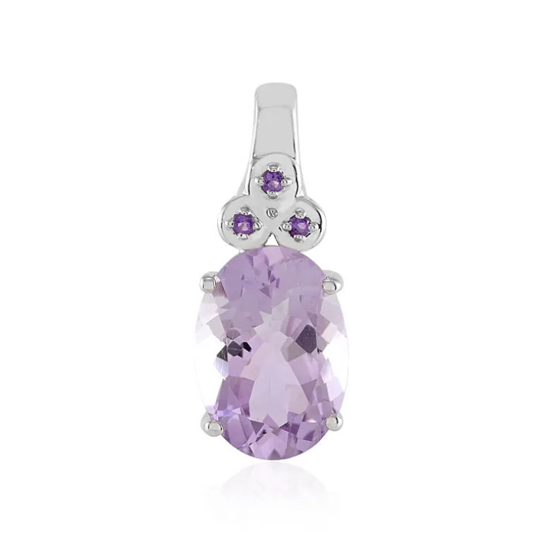 Lassen Sie sich vom Charme dieses exquisiten Anhängers verzaubern, der einen ovalen brasilianischen Lavendel-Amethysten im Brillantschliff von 5,13 Karat präsentiert. Akzentuiert mit drei Amethysten im Rundschliff, strahlt er einen anmutigen lila Farbton aus, gefasst in feinem 925er Sterlingsilber. Das Gesamtgewicht des Anhängers beträgt 5,157 ct und macht ihn zu einem unverzichtbaren Stück für Ihre Sammlung. Seine Größe von 25×10 mm ist perfekt, um einem Abendkleid einen Hauch von Raffinesse zu verleihen oder einen souveränen Look für die Geschäftskleidung zu kreieren.