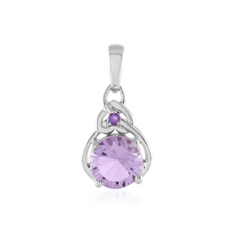 Dieser atemberaubende Anhänger zeigt die ruhige Schönheit eines brasilianischen Lavendel-Amethysten mit einem Gewicht von etwa 2 Karat. Der runde, konkav geschliffene Edelstein strahlt einen sanften, faszinierenden Farbton aus, der durch einen kleineren, rund geschliffenen Amethysten ergänzt wird, der einen Hauch von Funkeln hinzufügt. Gegossen in 925er Sterlingsilber mit einem Gesamtgewicht von etwa 1,86 Gramm ist dieses elegant gearbeitete Schmuckstück der Inbegriff von Raffinesse. Es passt sowohl zu legeren als auch zu formellen Anlässen und ist eine vielseitige Ergänzung für jede Schmucksammlung.