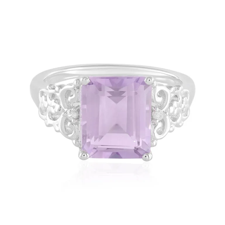 Schmücken Sie Ihre Hand mit der sanften Anziehungskraft dieses brasilianischen Lavendel-Amethyst-Rings, der einen prächtigen 4,086-karätigen Edelstein mit einem exquisiten Stufenschliff im Achteck präsentiert. Eingebettet in hochwertiges 925er Sterling Silber, verleiht ein verschlungenes Rankenwerk diesem bedeutenden Schmuckstück einen Vintage-Charme. Zwei funkelnde kambodschanische Zirkon-Akzente vervollständigen das Design und machen es zu einer perfekten Wahl für besondere Anlässe. Ideal, um sowohl der Tages- als auch der Abendgarderobe einen Hauch von Eleganz zu verleihen.