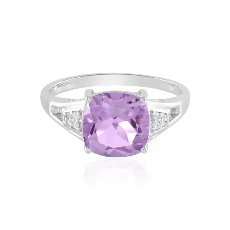 Entdecken Sie die Faszination Brasiliens mit diesem bezaubernden Lavendel-Amethyst-Silberring. Ein atemberaubender 3,645 Karat großer Edelstein im Kissenschliff ist das Herzstück, flankiert von funkelnden kambodschanischen Zirkon-Akzenten. Der aus Sterlingsilber gefertigte Ring strahlt einen zeitlosen Charme aus. Sein leuchtender Lavendelton verleiht sowohl Tages- als auch Abendgarderobe einen Hauch von Eleganz und macht ihn zu einer idealen Wahl für jeden Anlass.
