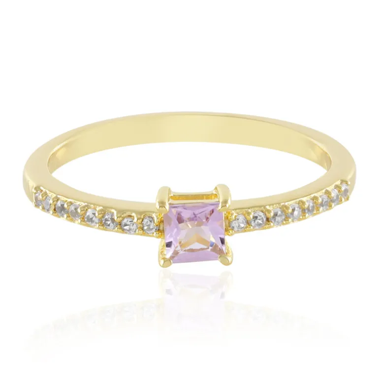 Entdecken Sie den subtilen Charme dieses Rings aus vergoldetem 925er Sterlingsilber, gekrönt von einem zarten brasilianischen Lavendel-Amethysten im Prinzessinnenschliff von 0,305 Karat. Um den zentralen Edelstein herum verleihen 16 kambodschanische Zirkonsteine von insgesamt 0,19 ct ein strahlendes Funkeln, das an eine elegante Konstellation erinnert. Die polierte Oberfläche und das moderne Design dieses Rings machen ihn zu einer vielseitigen Ergänzung jeder Schmucksammlung. Mit seinem sanften violetten Farbton und dem goldenen Schimmer passt er sowohl zu Freizeitkleidung als auch zu formellen Anlässen.