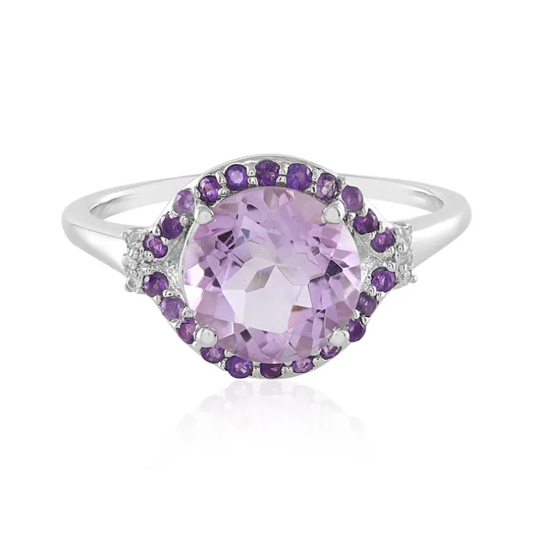 Dieser atemberaubende Ring bietet einen Hauch von lavendelfarbener Eleganz. Im Mittelpunkt steht ein glänzender brasilianischer Amethyst von 3,24 Karat im Rundschliff, der von einem Halo aus kleineren Amethysten und funkelnden Zirkon-Akzenten aus Kambodscha umgeben ist. Das Band aus 925er Sterlingsilber unterstreicht seinen Charme und macht ihn zu einem vielseitigen Schmuckstück, das mühelos vom Tag in die Nacht übergeht. Er eignet sich perfekt, um einem legeren Ensemble einen Farbakzent zu verleihen oder ein Abendkleid zu ergänzen und ist eine ideale Ergänzung für jede Schmucksammlung.