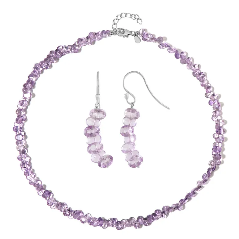 Entdecken Sie die Anziehungskraft Brasiliens mit diesem auffälligen Set aus lavendelfarbener Amethyst-Halskette und Ohrringen. Das glatte Perlendesign aus 925er Sterlingsilber präsentiert 72,45 Karat an facettierten ovalen Edelsteinen. Dieses Set ist ideal, um jedem Outfit einen Hauch von Eleganz zu verleihen und eignet sich sowohl für zwanglose Zusammenkünfte als auch für formelle Anlässe. Die Halskette lässt sich bequem zwischen 45 und 50 cm einstellen und wird durch 38 mm große Ohrringe ergänzt.