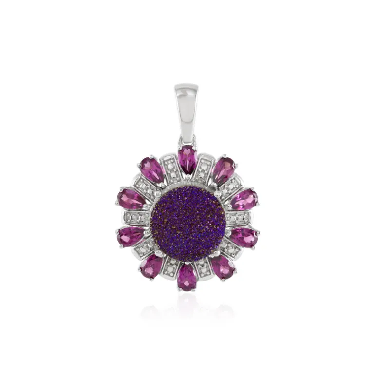 Entdecken Sie die schillernde Anziehungskraft dieses platinierten Sterlingsilber-Anhängers mit einem strahlenden brasilianischen Lavendel-Glitzer-Achat im Rundschliff, der von birnenförmigen indischen Rhodolithen umgeben ist. Mit einem Gesamtgewicht von 6,057 Karat funkelt er in einer Symphonie aus lila und leuchtend rosa Farbtönen. Dieser Anhänger ist ideal, um Ihrer Alltagskleidung oder besonderen Anlässen einen Hauch von Eleganz zu verleihen und verspricht, ein fesselndes Herzstück für jedes Ensemble zu sein.