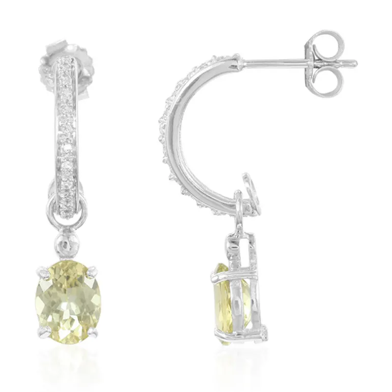 Entdecken Sie das sonnenbeschienene Funkeln dieser eleganten Silberohrringe mit 2,16 Karat Zitronen-Apatit im Ovalschliff aus Madagaskar, gepaart mit schillernden weißen Topas-Akzenten aus Brasilien. Jeder Edelstein ist sorgfältig in poliertes 925er Sterling Silber gefasst und hat ein Gesamtgewicht von 2,296 Karat. Die baumelnden Schmuckstücke sind 28 mm groß und verleihen Ihrer klassischen Garderobe einen modernen Twist, der sich sowohl für den Alltag als auch für besondere Anlässe eignet.