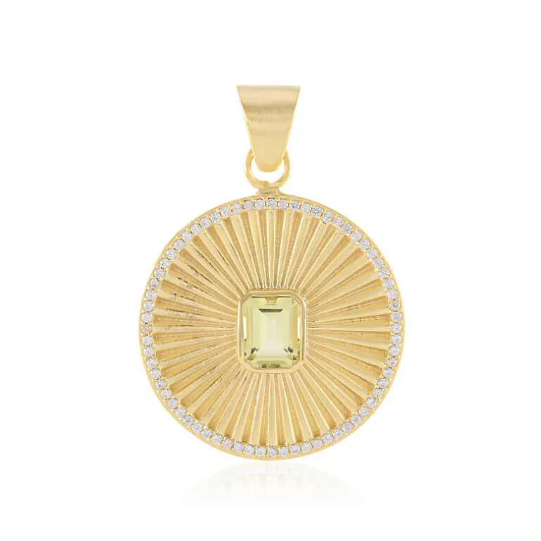 Dieser atemberaubende Anhänger besteht aus einem strahlenden Zitronenquarz aus Brasilien, der fachmännisch im Achteck-Schliff geschliffen wurde, um seine einzigartige Schönheit zu unterstreichen. Akzentuiert mit 68 Zirkonen im Rundschliff aus Kambodscha, strahlt der Anhänger Eleganz und Raffinesse aus. Dieses vergoldete Schmuckstück eignet sich sowohl für legere als auch für formelle Anlässe. Kombinieren Sie es mit einem klassischen Abendkleid oder einem eleganten Tagesoutfit, um Ihrem Look einen Hauch von Luxus und Glanz zu verleihen.