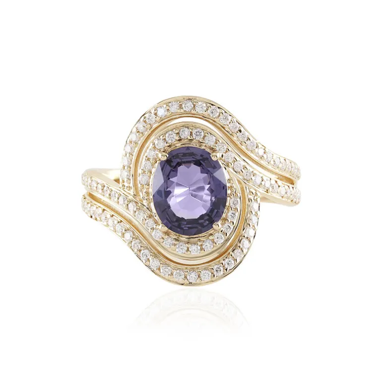 Dieser luxuriöse Ring enthält einen lavendelfarbenen Luc Yen-Spinell von 1,995 ct. im ovalen Brillantschliff, eingebettet in einen Kranz von 94 Diamanten der Reinheit SI1 von insgesamt 0,447 ct. Mit einem Gewicht von ca. 8,82 g ist der aus prächtigem 14-karätigem Gelbgold gefertigte Schmuck ein Beispiel für Raffinesse. Der verschnörkelte Ring mit den Maßen 27 x 23 mm zeugt von zeitloser Eleganz und eignet sich perfekt für Galaveranstaltungen oder um Ihrer Geschäftskleidung einen Hauch von Glamour zu verleihen.