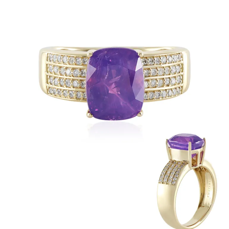 Dieses atemberaubende Schmuckstück ist ein Zeugnis von Luxus. Es zeigt einen majestätischen, unerhitzten Luc-Yen-Saphir von 5,938 Karat aus Vietnam im klassischen Antikschliff. Der elegante, aus 750er Gelbgold gefertigte Ring ist mit 52 Diamanten SI1 (H) besetzt, die den königlichen violetten Farbton des Saphirs brillant unterstreichen. Mit einem Gewicht von ca. 6,17 Gramm und einem Gesamtkaratgewicht von 6,208 ct ist dieser Ring von AMAYANI ein Schmuckstück, das sich als Erbstück eignet. Er eignet sich perfekt für anspruchsvolle Anlässe und passt sowohl zu Abendkleidern als auch zu eleganter Geschäftskleidung.