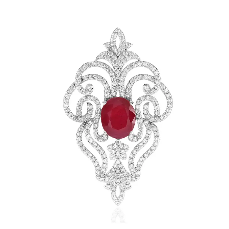 Dieser atemberaubende Anhänger präsentiert einen glänzenden Rubin aus Madagaskar mit einem Gewicht von 6,73 Karat und einem ovalen Schliff, der Raffinesse ausstrahlt. Er ist von 226 glitzernden kambodschanischen Zirkonen von insgesamt 2,898 Karat umgeben und in warmes 9-karätiges Gold mit einem Gesamtgewicht von etwa 6,4 Gramm gefasst. Das komplizierte Design strahlt eine königliche Atmosphäre aus und eignet sich perfekt für besondere Anlässe oder als elegante Ergänzung zu Ihrem Alltagsoutfit.