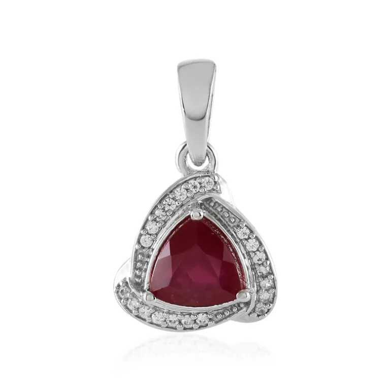Dieser exquisite Anhänger zeigt einen atemberaubenden Madagaskar-Rubin im Trillant-Schliff von 1,395 Karat, der von 21 kambodschanischen Zirkonen umgeben ist. Dieses elegante Stück aus glänzendem 925er Sterlingsilber mit Platinbeschichtung ist perfekt, um jedem Outfit einen Hauch von Luxus zu verleihen. Es ist ideal für den Abend oder besondere Anlässe und kann mit den passenden Ohrringen kombiniert werden, um den Look zu vervollständigen.