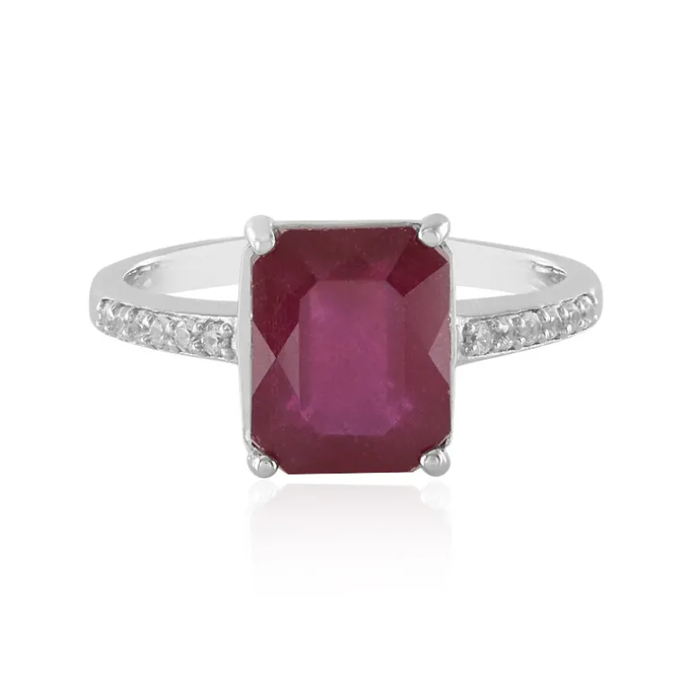 Genießen Sie das Strahlen dieses exquisiten Rings mit einem Madagaskar-Rubin, dessen Herzstück ein 4,016 ct großer achteckiger Strahlenschliff ist. Der lebendige Rubin wird elegant von 12 kambodschanischen Zirkonen im Rundschliff mit einem Gesamtgewicht von 0,176 Karat umrahmt, die das Funkeln noch verstärken. Dieser Ring aus platiniertem 925er Sterling Silber strahlt Raffinesse und Anmut aus. Ein perfektes Schmuckstück für Galaveranstaltungen oder eine opulente Note für Ihre Alltagskleidung.
