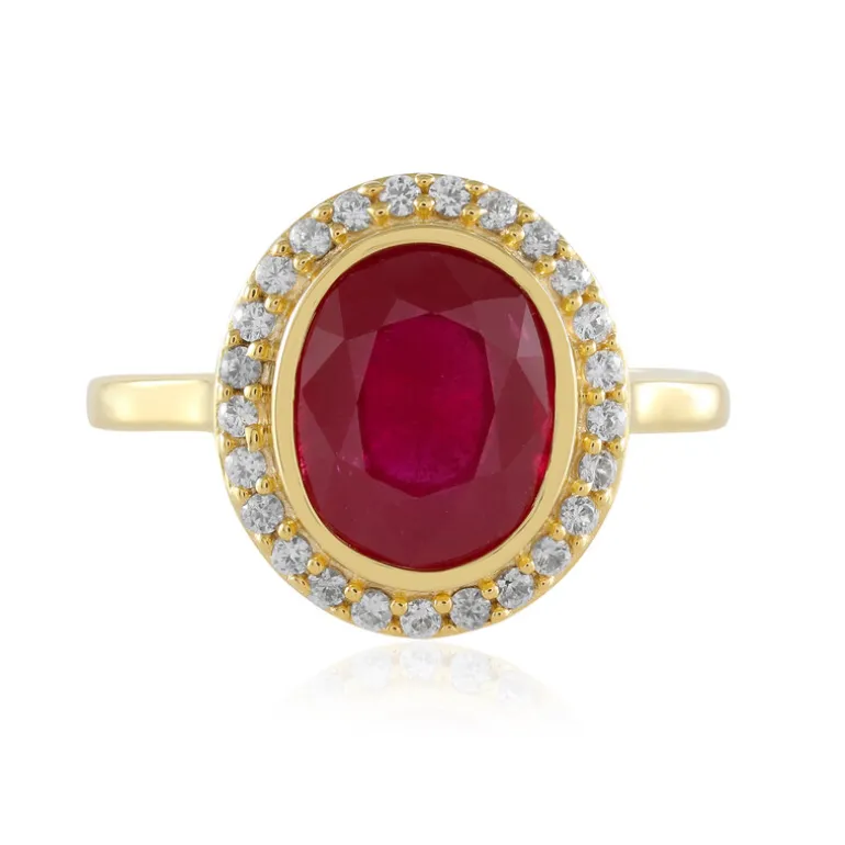 Erleben Sie Eleganz mit diesem atemberaubenden Ring mit Madagaskar-Rubin. Mit einem ovalen Rubin im Brillantschliff von 4,207 Karat, der von 25 kambodschanischen Zirkonen wunderschön akzentuiert wird, strahlt dieses Schmuckstück Raffinesse aus. Der Ring ist aus vergoldetem 925er Sterlingsilber gefertigt und eignet sich perfekt für besondere Anlässe oder den Alltag. Kombinieren Sie ihn mit einem eleganten Kleid für einen unvergesslichen Look.