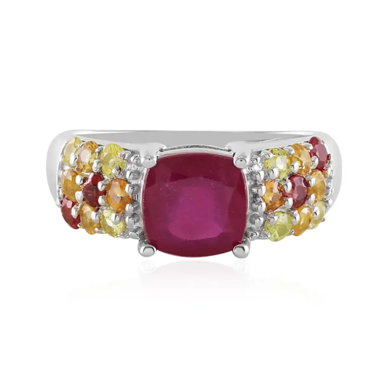 Dieser Ring mit einem Madagaskar-Rubin im Kissenschliff mit einem Durchmesser von 1,934 Karat verzaubert die Sinne. Flankiert von 0,916 Karat Saphiren im Rundschliff in Sonnenuntergangstönen, strahlt dieser Ring eine warme Ausstrahlung aus. Das feine 925er Sterling Silberband mit Platinbeschichtung bietet eine stilvolle und dauerhafte Basis für das 23×19 mm große Design. Dieses Schmuckstück ist sowohl für formelle Anlässe als auch für den Alltag geeignet und passt perfekt zu farbenfrohen wie auch neutral getönten Ensembles.