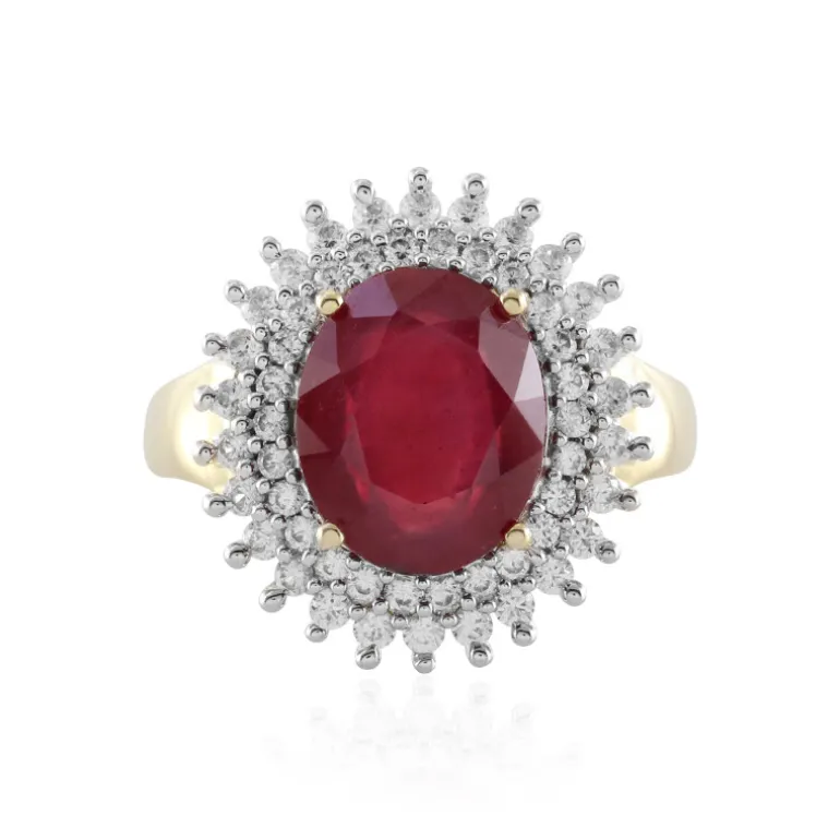 Dieser exquisite Ring mit einem Rubin aus Madagaskar verleiht Ihrer Hand einen ganz besonderen Glanz. Im Mittelpunkt steht ein glänzender, ovaler Rubin von 4,725 Karat, der von einem funkelnden Halo aus 52 runden Zirkonen aus Kambodscha von insgesamt 0,725 Karat umschlossen wird. Der aus 925er Sterlingsilber gefertigte und mit einer prächtigen Goldplattierung versehene Ring verbindet zeitlose Eleganz mit modernem Flair. Perfekt für Galaveranstaltungen oder als Farbakzent im Alltag, ist dieser Ring eine vielseitige Ergänzung für jede Schmucksammlung.