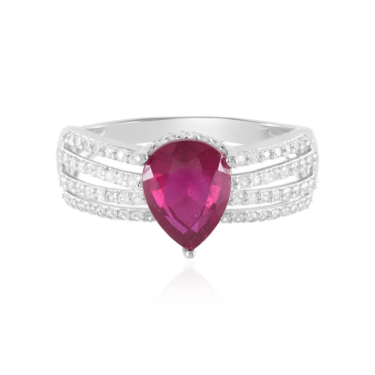 Dieser atemberaubende Ring präsentiert einen leuchtenden Madagaskar-Rubin in Tropfenform mit einem Gewicht von 1,575 ct., der in ein Band eingefasst ist, das mit 78 schimmernden Zirkonen aus Kambodscha mit einem Gesamtgewicht von 0,491 ct. geschmückt ist. Der Ring ist aus hochwertigem 925er Sterlingsilber gegossen und wiegt ca. 2,07 g, das Gesamtgewicht der Edelsteine beträgt 2,066 ct. Perfekt für alle, die sowohl klassische Eleganz als auch einen Hauch von modernem Flair zu schätzen wissen. Dieses Schmuckstück passt zu jedem Outfit, von leger bis formell.