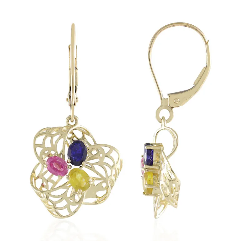 Entdecken Sie die Eleganz dieser atemberaubenden Goldohrringe mit einem Trio aus Madagaskar-Saphiren in Gelb, Rosa und Blau. Die 31 mm großen Ohrringe sind aus 9-karätigem Gold gefertigt und präsentieren 1,35 Karat lebhafte Edelsteine in einem exquisiten durchbrochenen Design. Ideal für Abendveranstaltungen oder besondere Anlässe. Kombinieren Sie sie mit einem kleinen schwarzen Kleid oder einem schicken Ensemble, um ihre lebhafte Ausstrahlung zu betonen.