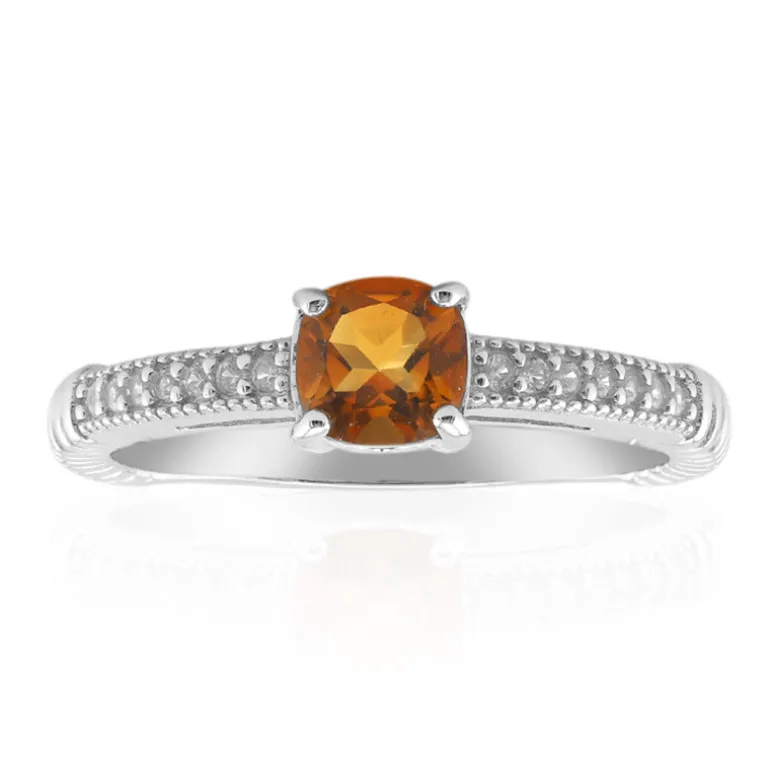 Dieser bezaubernde Ring zeigt einen brasilianischen Madeira-Citrin mit einem satten, bernsteinfarbenen Farbton, der Wärme ausstrahlt. Der antike Edelstein im Kissenschliff ist elegant in ein 925er Sterlingsilberband eingebettet und wird von funkelnden runden Zirkonen aus Tansania flankiert, die Vintage-Charme mit moderner Handwerkskunst verbinden. Mit einem Gesamtkaratgewicht von 0,583 Karat ist dieses Stück eine zeitlose Ergänzung für jede Sammlung oder ein exquisites Geschenk. Er eignet sich perfekt, um Ihrem Outfit einen Hauch herbstlicher Eleganz zu verleihen, und ist ein vielseitiges Must-have für Ihr Schmuckkästchen.